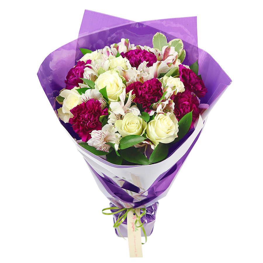 Introducing our Luxury in Full Bloom bouquet, a masterfully arranged collection that celebrates the best of summer. This bouquet harmoniously pairs luxurious white roses with the charm of alstroemeria and the vivid touch of purple carnations, complemented by lush greenery. Each flower is meticulously hand-selected to ensure it meets our premium standards.
