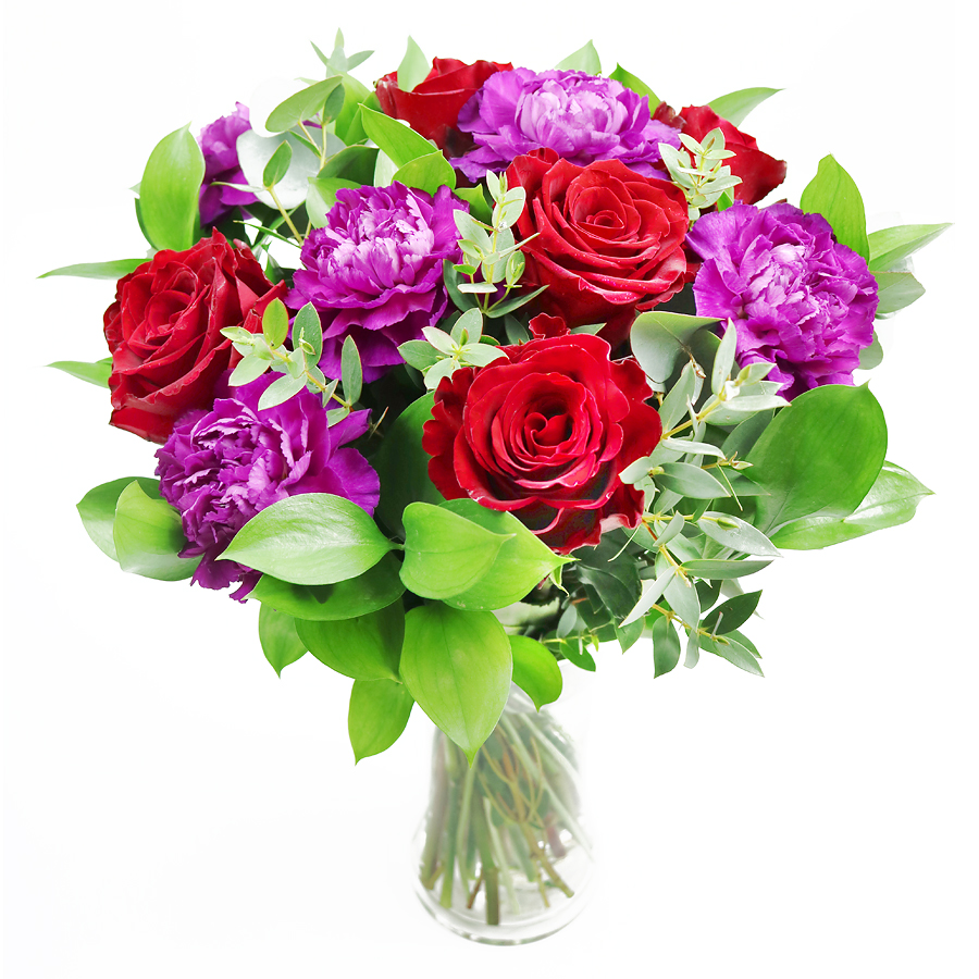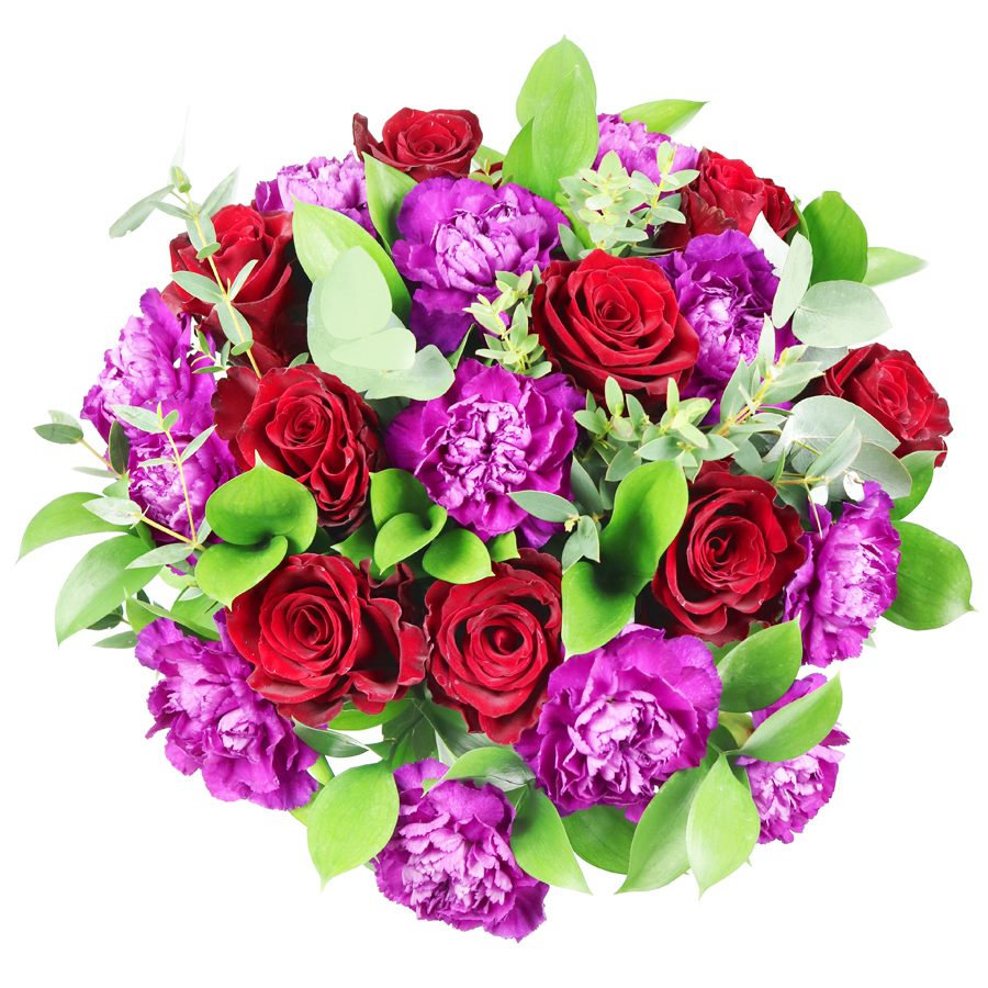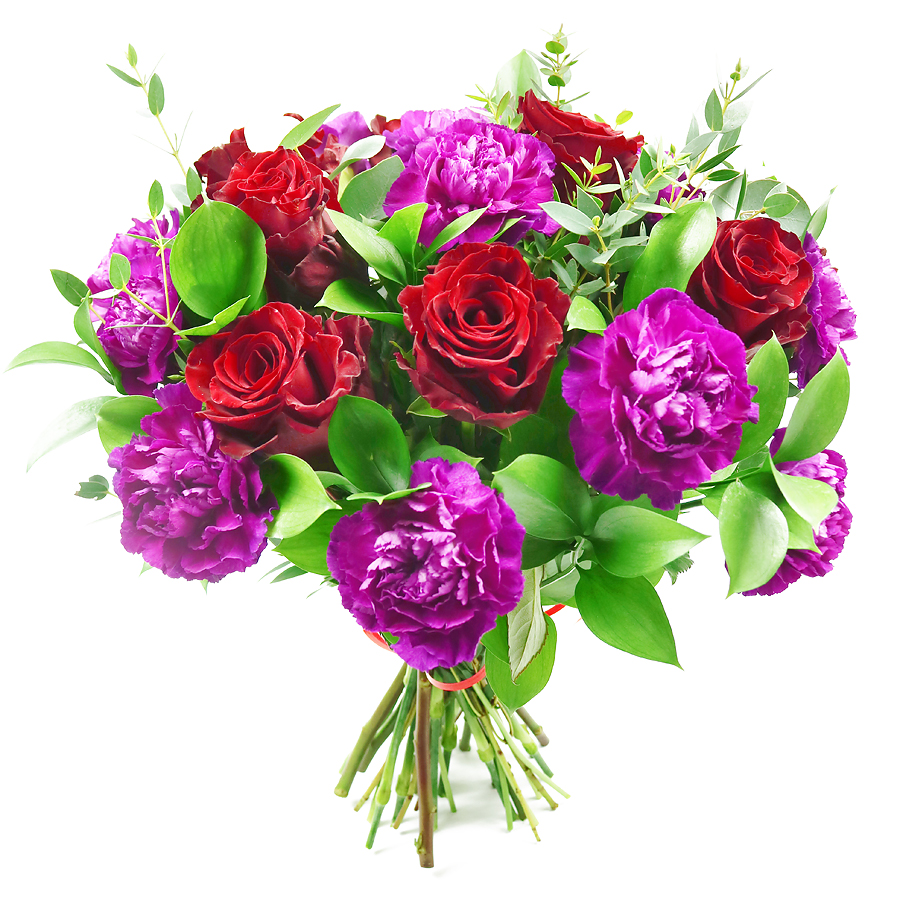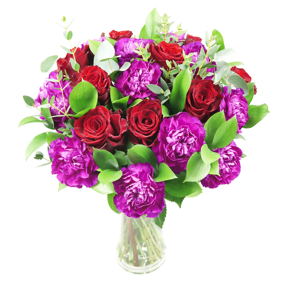 Express your everlasting love with our timeless red rose bouquet, featuring classic red roses, cheerful cerise carnations, lush ruscus, and fragrant eucalyptus. This unique and elegant arrangement is perfect for any occasion that calls for a special and meaningful gift.