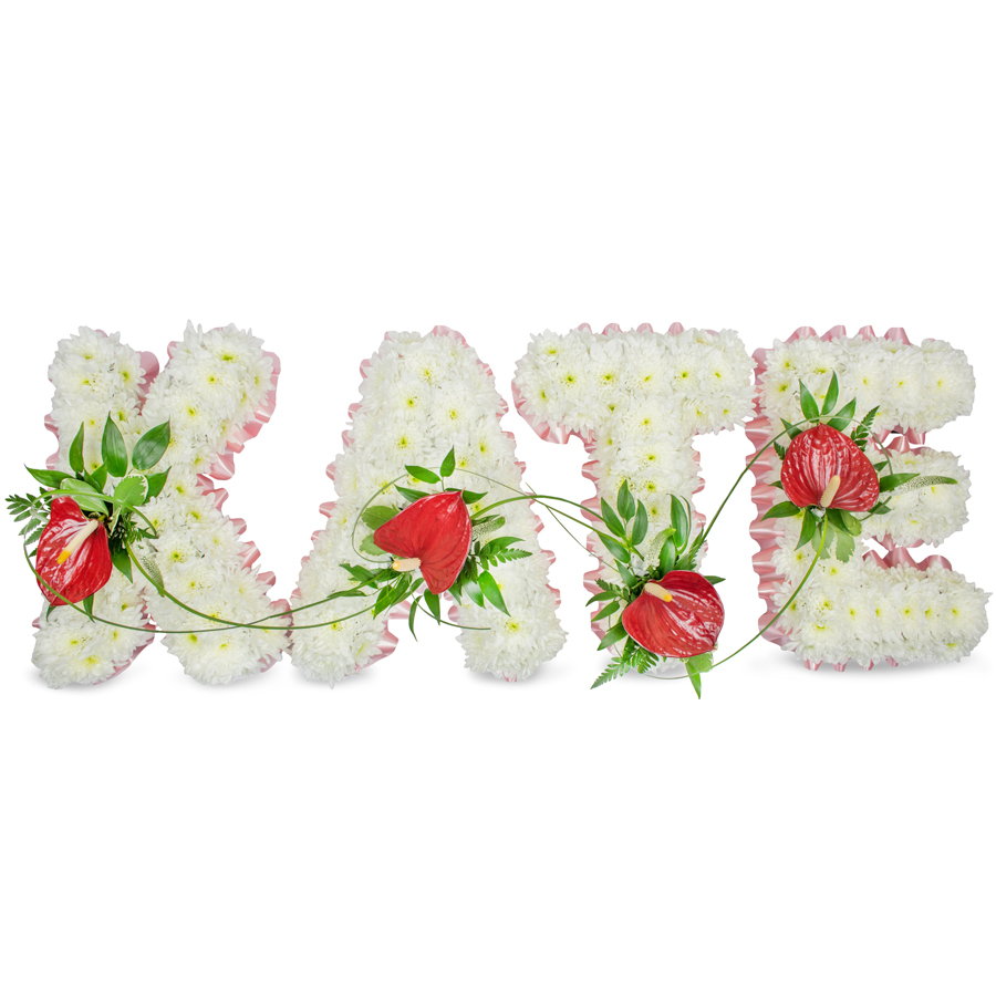 Express your love and heartfelt memories with the Darling Kate Tribute from Florist Raynes Park. Expertly handcrafted by our skilled florists in Raynes Park, this elegant funeral letter tribute can be personalised with any letters or numbers of your choice, creating a truly unique final farewell. Using a luxurious bed of fresh white chrysanthemums, the tribute is accented with statement anthurium, delicate white veronica and rich greenery including pittosporum, ruscus, leather leaves and bear grass for a refined, peaceful finish. Designed to convey sympathy, support and everlasting love, this premium floral tribute is ideal for funerals, memorial services and celebrations of life. Approximate dimensions: Height 28cm (11"), Width 115cm (45"). At Florist Raynes Park, we use only the freshest seasonal flowers and uphold a quality-first substitution policy, ensuring equal or superior style and value if any blooms are unavailable. Personalised tributes with any combination of letters or numbers are available on request. Contact our friendly team on 020 3409 3030 or email [email protected] to discuss your bespoke design and delivery options from our Raynes Park florist.