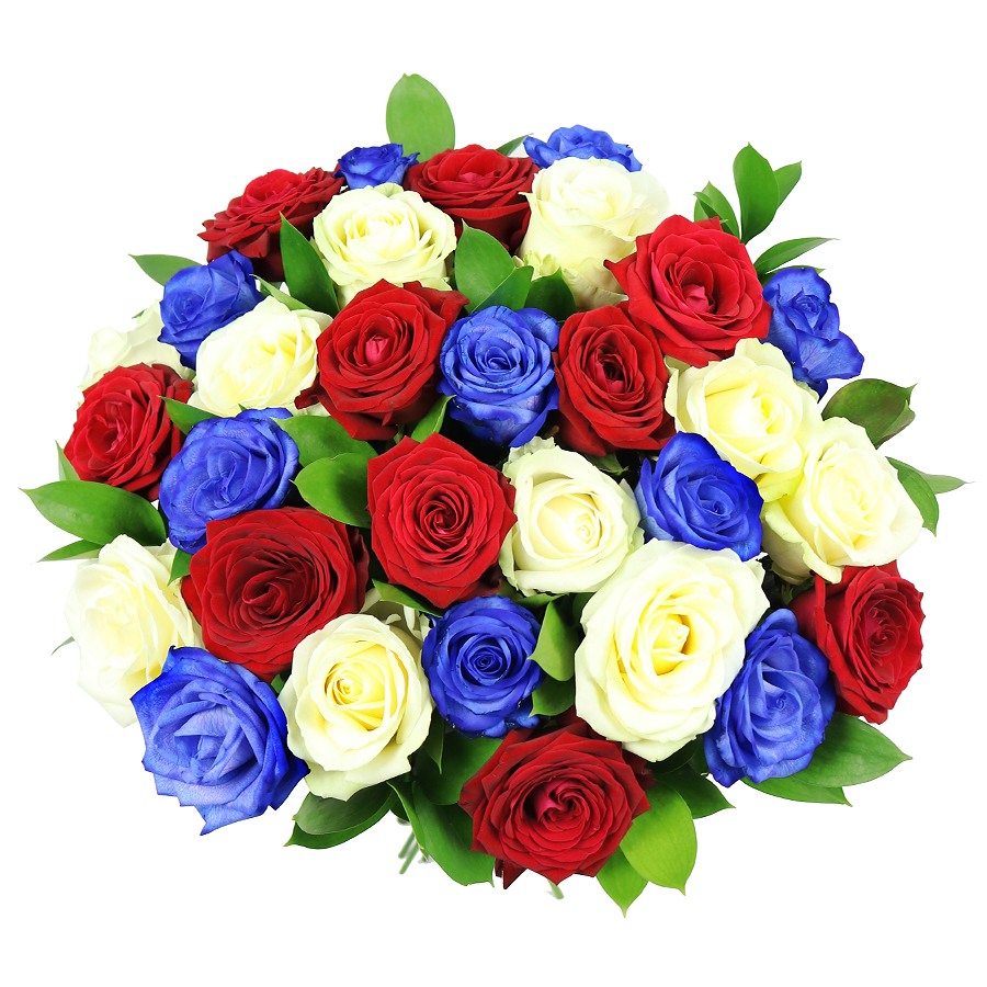 Celebrate special moments with our unique bouquet, showcasing a harmonious mix of blue, white, and red roses complemented by fresh Ruscus. Ideal as a birthday surprise or a stunning centerpiece to elevate your home decor.