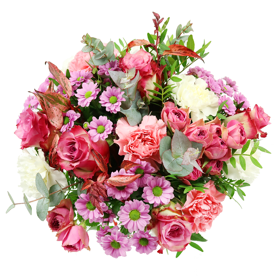 Our Love Whisper bouquet which is made up of pink spray roses, pinkish white roses, pink carnations, white carnations, pink santini chrysanthemums, eucalyptus, pistacia and greenery. Vase included.