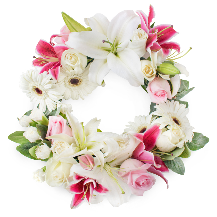 A glorious wreath in shades of pink, purple and white. Liliums, Roses, Gerbera and Carnations are carefully hand-picked and designed in this beautiful flower composition.
