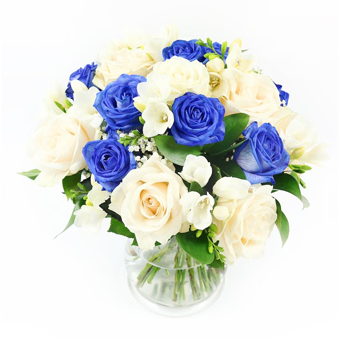 Show your deep condolences with this sypmathy bouquet made up by red and blue sprayed roses, freesia, gypsophila and greenery.