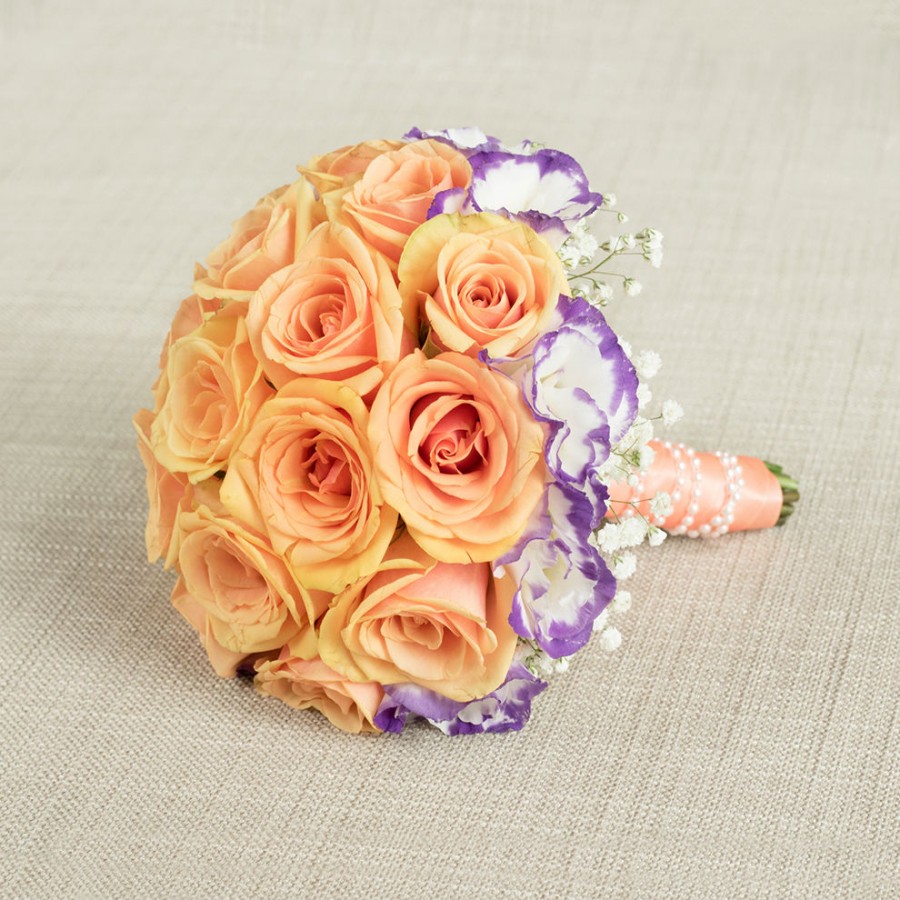 Our graceful wedding bouquet combines the timeless beauty of peach orange roses, white-purple lisianthus, and delicate gypsophila. This unique arrangement is designed to complement your elegance and add a touch of sophistication to your special day.