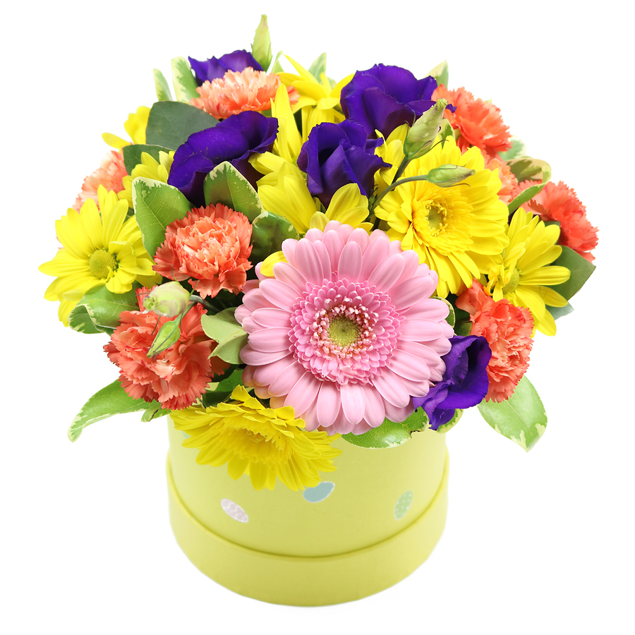 Celebrate Easter with our exquisite flower ensemble. This bouquet features a beautiful mix of pink and yellow gerberas, orange carnations, purple lisianthus, and fresh greenery, all carefully hand-selected for maximum freshness and appeal.